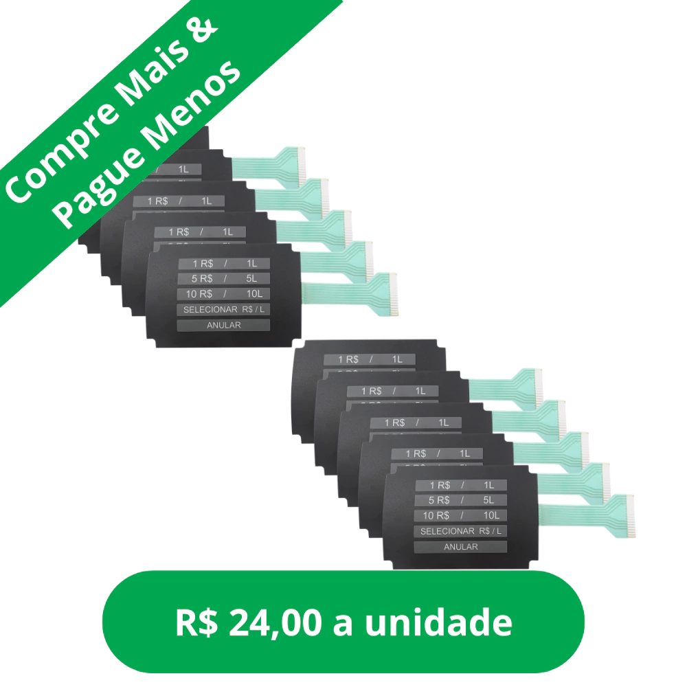 Adesivo de reposição fabricado com circuito flexível (parte eletrônica) com exatos 15,4 cm de largura x 10 cm de altura. Esse produto se aplica no modelo: Bomba Gilbarco 5 Teclas G.