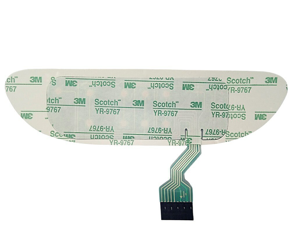 Adesivo de reposição fabricado com circuito flexível (parte eletrônica) com exatos 22,9 cm de largura x 6,3 cm de altura.