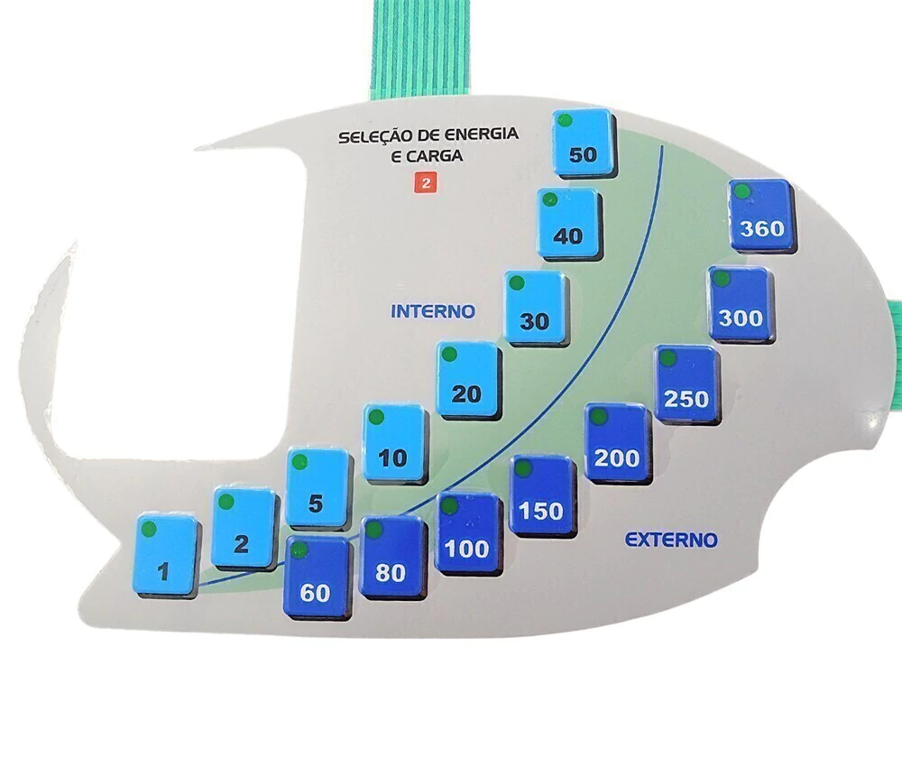 Adesivo de reposição fabricado com circuito flexível (parte eletrônica) com exatos 17 cm de largura x 10,6 cm de altura. Esse produto se aplica no modelo: Desfibrilador Cardíaco Dx 10 Plus Emai fabricante: Emai.